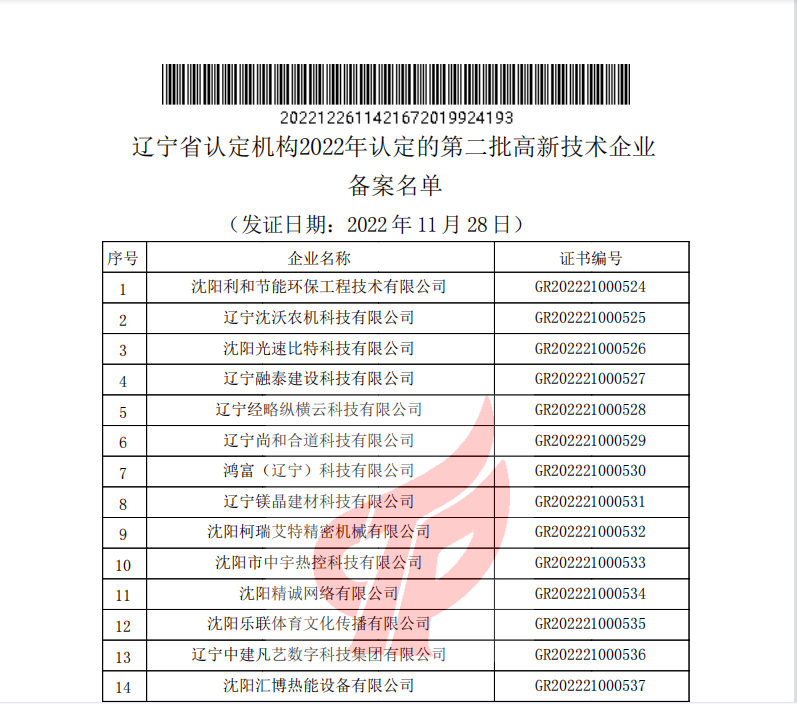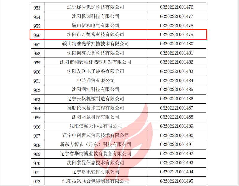 2022年12月26日,全國(guó)高新技術(shù)企業(yè)認(rèn)定管理工作領(lǐng)導(dǎo)小組辦公室正式發(fā)函,公布了遼寧省2022年認(rèn)定的第二批高新技術(shù)企業(yè)備案名單。沈陽(yáng)市萬(wàn)德富科技有限公司成功通過(guò)國(guó)家高新技術(shù)企業(yè)認(rèn)定。